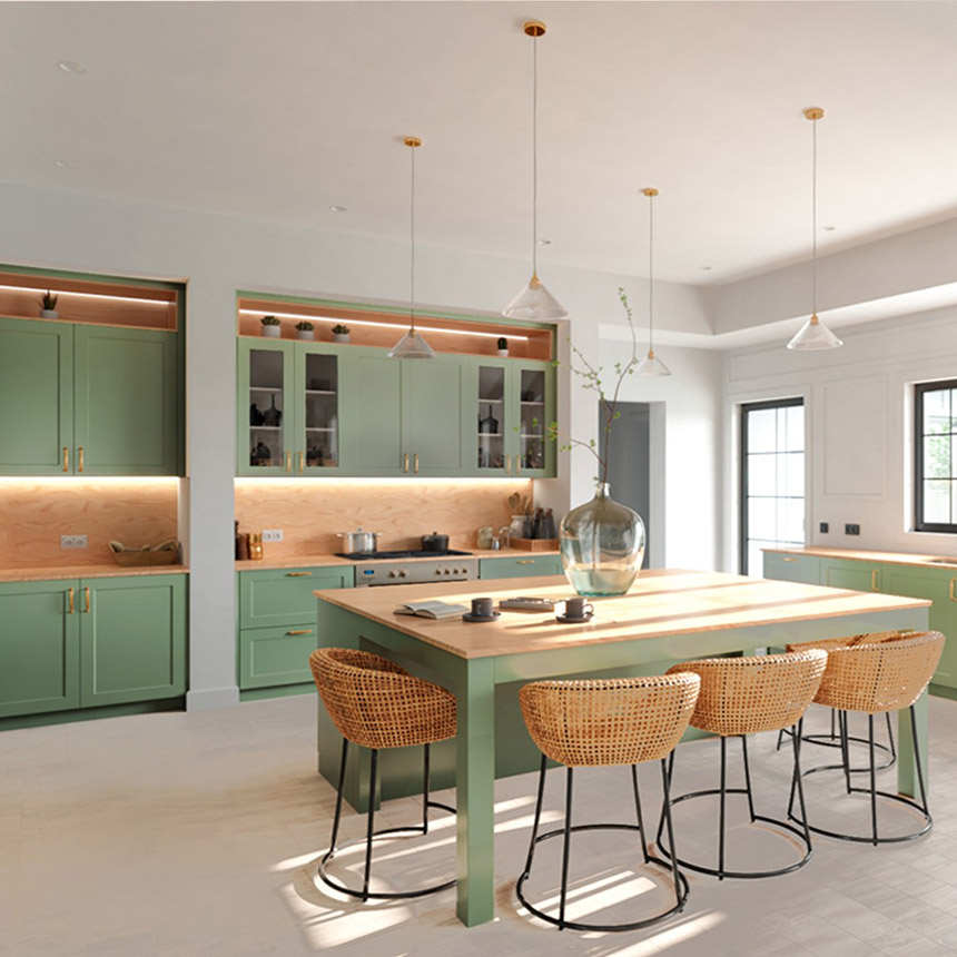 Al relajante verde oliva, en simbiosis con la calidez de la madera, se incorporan tiradores en negro y acabados dorados, encimeras de piedra clara y suelos de madera mate añadiendo elegancia, sofisticación y personalidad al ambiente.