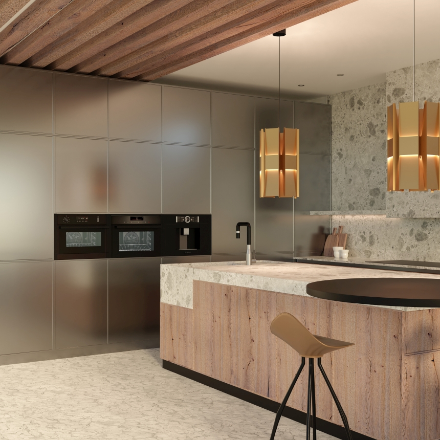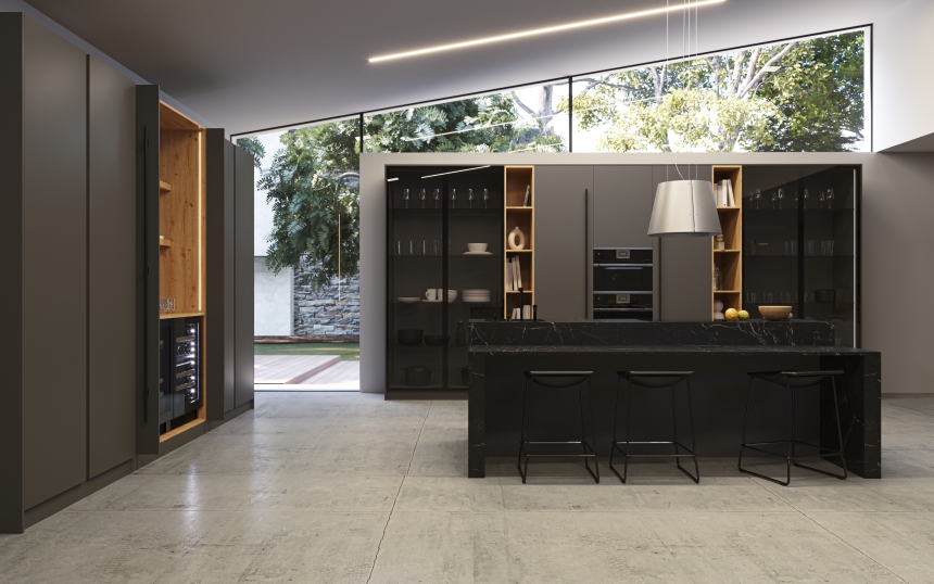 Por su parte, la marca de mueble de cocinas de Grupo Porcelanosa, habla del auge de los acabados metalizados que, al elevar la cocina de espacio funcional a pieza escultural, aportan una excelente profundidad visual. En este sentido, destacan sus acabados metalizados Pyrite, Copper y Titanium, con el ejemplo de su cocina Emotions E9.30r Xtone Navona Lapado Ranurado con el acabado E3.90 Pyrite. Verdadero protagonista de la propuesta, este acabado metalizado se aplica de forma extensiva en todos los frentes del mobiliario de la zona de columnas.