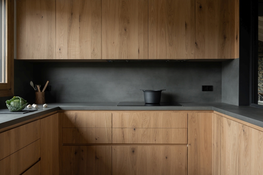 Como explican desde Gamadecor, este acabado metalizado busca la complejidad del mineral, ofreciendo una superficie que oscila entre el gris profundo y los destellos cálidos. Igualmente, en la cocina mencionada, la monotonía del metal se «rompe» con un módulo abierto que es un ejercicio de calidez por sus estantes en acabado roble e iluminación LED integrada.