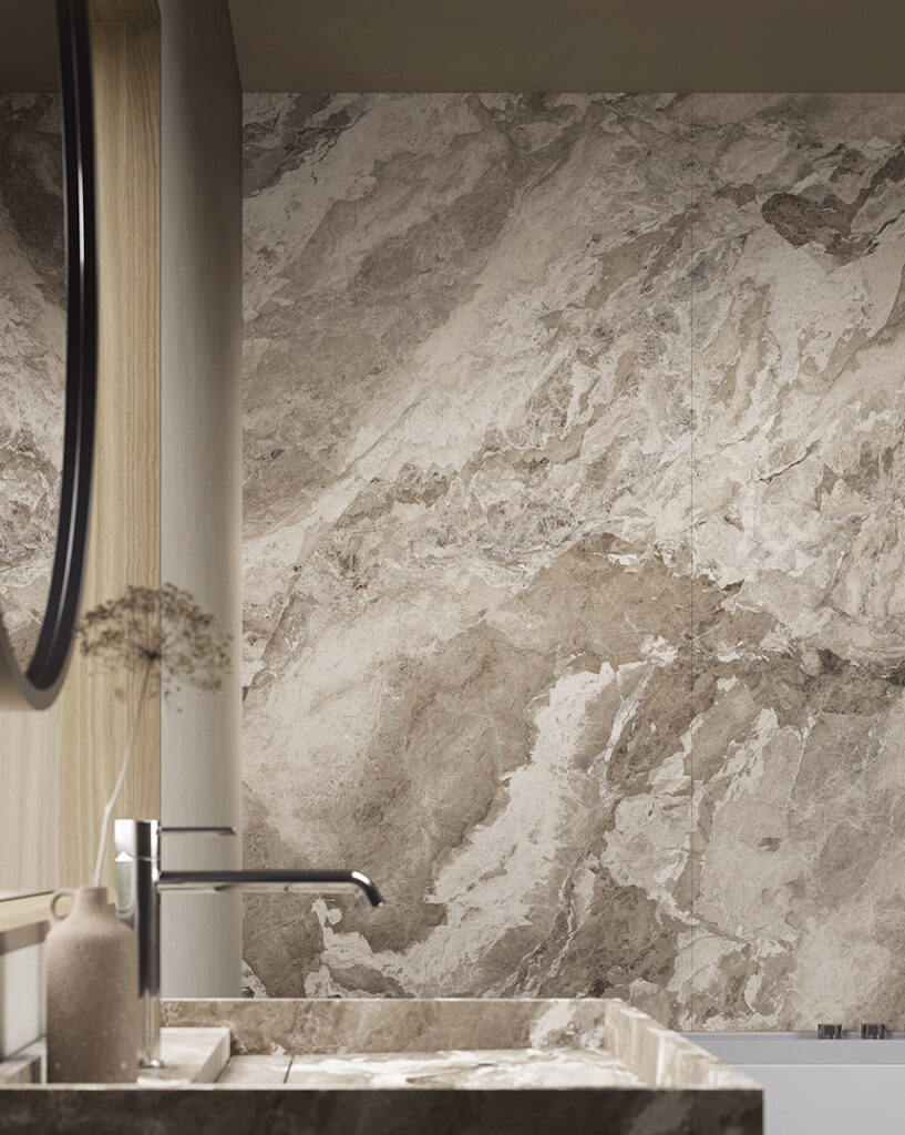 La superficie de esta piedra natural muestra cálidos matices beige hendidos por ligeras vetas. Su tacto elegante, como el del travertino o a la piedra caliza, transmite serenidad y discreción. Ideal para resaltar el diseño sofisticado de los espacios, esta piedra irradia un lujo atemporal capaz de convertir cualquier ambiente en un oasis cálido y sofisticado.