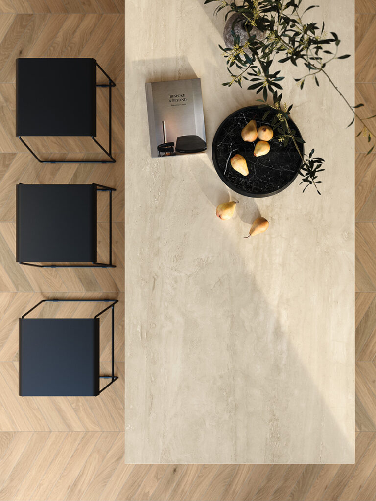 Gracias a su alto rendimiento técnico, Travertino Navona White también resulta especialmente adecuado para proyectos contract, así como para espacios públicos y comerciales que requieren un impacto visual fuerte y duradero.